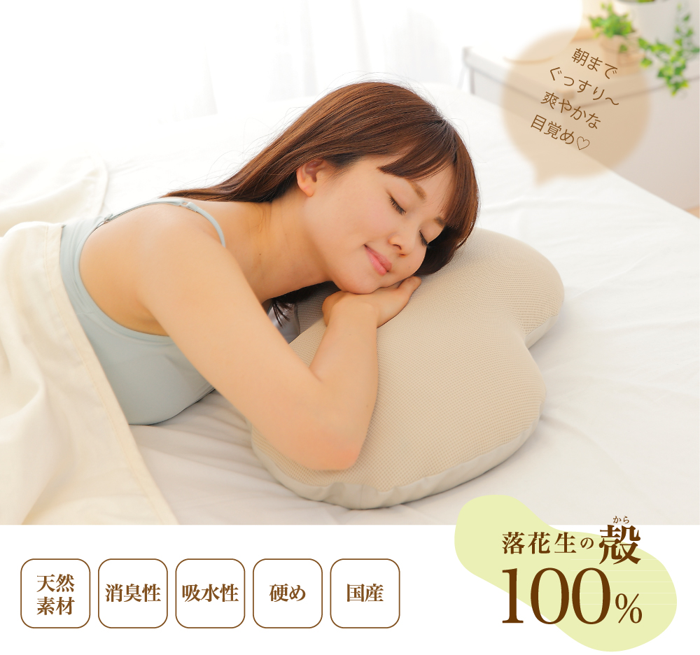 落花生の殻には、枕の素材として必要不可欠な吸水性やクッション性などの枕としての基本機能が揃っているだけでなく、臭いを軽減させる消臭効果等の高付加価値機能も確認されています。