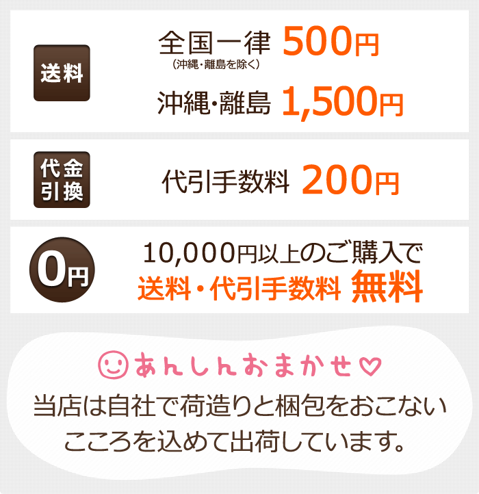 | 代金引換手数料 | 代引き手数料 200円 10,000円以上のご購入で無料 |